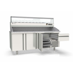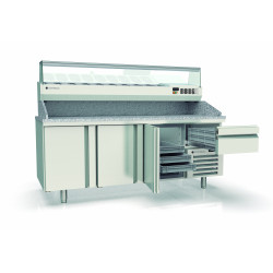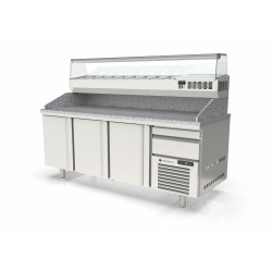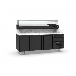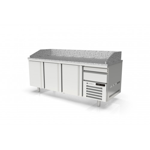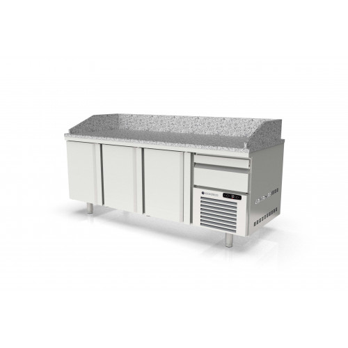 Meuble positif - Série pizza 800 - Série Top - Température -2°/+8°C - 3 portes pleines + 1 tiroir neutre avec 3 bacs plastiques (600x400x70mm) - Capacité 595L - Dessus granit avec dosseret et joues de 180 mm - Extérieur et intérieur en inox AISI-304 18/10 (sauf partie arrière en galva) - Thermostat électronique avec afficheur digital, spécial économie d'énergie - Alarme haute et basse température sur contrôleur digital - Evaporateur ventilé traité anti-corrosion - Compresseur hermétique ventilé sur glissières - Evaporation automatique des eaux de dégivrage - Porte emboutie et réversible - Charnière inox - Joint déclispable - Pieds inox réglables en hauteur de 135 à 210 mm - Livré avec 4 jeux de glissières inox par porte réglable en hauteur - Ambiance 43°C
