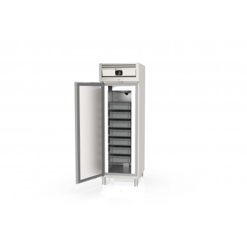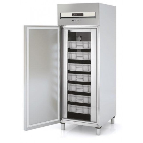 Armoire à casiers (poissons, viandes ou légumes) - Température positive (-4°/+4°C) - Capacité 610l - 1 porte pleine - Extérieur en inox AISI-304 18/10 (sauf partie arrière) - Intérieur en inox AISI-304 - Evaporateur anti-corrosion et compresseur hermétique ventilé - Thermostat électronique avec affichage digital - Arrêt de la ventilation à l'ouverture de la porte - Système de récupération individuelle des eaux de chaque bac - Eclairage intérieur LED - Serrure en standard - Pieds inox réglables de 125 à 200mm - Ambiance 43°C - Dotation : 7 bacs avec fond perforé inox 400x600x120 mm