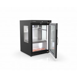 Armoire noire de maturation viande (Dry Aging) - 1 porte vitrée + côtés panoramiques - Double éclairage LED - Intérieur en acier inox AISI-304 avec fond embouti - Extérieur en acier inox plastifié, noir (sauf partie arrière) - Portes à ouverture réversible, avec système de fermeture automatique et joint d'étanchéité avec profilés en aluminium anodisés et double vitrage avec traitement basse émissivité (low E) : réduit la condensation - Thermostat électronique avec afficheur digital, dégivrages optimisés, alarme pour porte ouverte et pour haute et basse température de condensation, spécial économie d'énergie