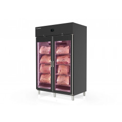 Armoire noire de maturation viande (Dry Aging) - 2 portes vitrées - Double éclairage LED - Intérieur en acier inox AISI-304 avec fond embouti - Extérieur en acier inox plastifié, noir (sauf partie arrière) - Portes à ouverture réversible, avec système de fermeture automatique et joint d'étanchéité avec profilés en aluminium anodisés et double vitrage avec traitement basse émissivité (low E) : réduit la condensation - Thermostat électronique avec afficheur digital, dégivrages optimisés, alarme pour porte ouverte et pour haute et basse température de condensation, spécial économie d'énergie