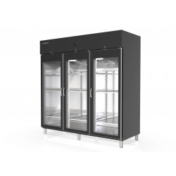Armoire de maturation viande (Dry Aging) - 3 portes vitrées - Double éclairage LED - Intérieur en acier inox AISI-304 avec fond embouti - Extérieur en acier inox plastifié, noir (sauf partie arrière) - Portes à ouverture réversible, avec système de fermeture automatique et joint d'étanchéité avec profilés en aluminium anodisés et double vitrage avec traitement basse émissivité (low E) : réduit la condensation - Thermostat électronique avec afficheur digital, dégivrages optimisés, alarme pour porte ouverte et pour haute et basse température de condensation, spécial économie d'énergie