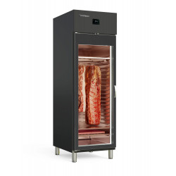 Armoire noire de maturation viande (Dry Aging) - 1 porte vitrée - Double éclairage LED - Intérieur en acier inox AISI-304 avec fond embouti - Extérieur en acier inox plastifié, noir (sauf partie arrière) - Portes à ouverture réversible, avec système de fermeture automatique et joint d'étanchéité avec profilés en aluminium anodisés et double vitrage avec traitement basse émissivité (low E) : réduit la condensation - Thermostat électronique avec afficheur digital, dégivrages optimisés, alarme pour porte ouverte et pour haute et basse température de condensation, spécial économie d'énergie