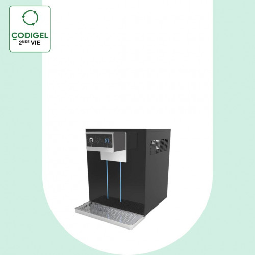 Refroidisseur d'eau HI-CLASS à poser - Détente directe avec banc de glace - Façade en verre trempé noir avec insert en inox traité contre les marques de doigts - Débit continu : 40 L - Débit (h) : 65 L - Eau ambiante + eau froide réglable 3°/10°C + eau gazeuse - Hauteur de passage : 269 mm - - Zone de distribution avec hauteur ajustable - Bac recueil gouttes amovible raccordable sur vidange - Compresseur : 1/6 cv