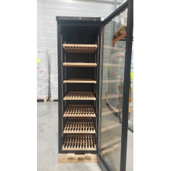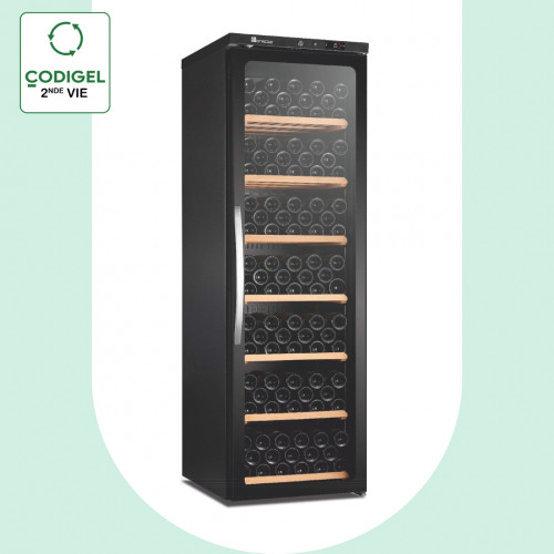 Armoire à vin mono-température - Gamme Exclusive - Tôle intérieure plastifiée (skinplate noir) - Tôle plastifiée extérieure (skinplate noir) - Isolation 50 mm de polyuréthane à base d’eau - Froid ventilé avec dégivrage automatique - Porte en verre avec protection anti UV - Porte réversible - Éclairage LED ambré - Serrure standard - Système anti-vibration - Filtre à charbon actif - Température définie par l’utilisateur - 10 étiquettes de bouteilles visibles - Étagères coulissantes en bois + 1 fixe sur le fond 6 x (453x543mm) + 1 (490x390mm) - 4 curseurs + 2 pieds de nivellement