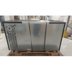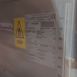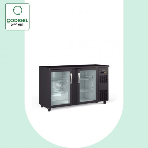 Arrière bar - Température +2°/+8°C - 2 portes vitrées battantes (double vitrage) - Stockage : 320 bouteilles (33cl) - Capacité : 325l - Extérieur en acier galvanisé plastifié noir - Intérieur en acier plastifié gris - Eclairage intérieur LED - Serrure en standard - Thermostat électronique avec afficheur digital, spécial économie d'énergie, protégé des projections - Compresseur hermétique ventilé - Evaporateur et condenseur ventilés - Evaporation automatique des eaux de dégivrage - Alarme haute et basse température sur contrôleur digital - Pieds réglables pour obtenir une hauteur de 880 mm (inclus) - Livré avec 2 clayettes rilsan réglables en hauteur