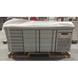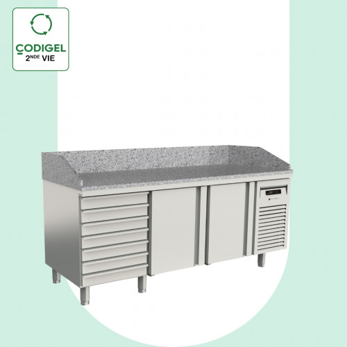 Meuble positif - Série pizza 700 - Série Top - Température -2°/+8°C - 2 portes pleines + 1 bloc de 7 tiroirs neutres (casiers non inclus) - Capacité 450L - Dessus granit avec dosseret et joues de 180 mm - Extérieur et intérieur en inox AISI-304 18/10 (sauf partie arrière en galva) - Thermostat électronique avec afficheur digital, spécial économie d'énergie - Alarme haute et basse température sur contrôleur digital - Evaporateur ventilé traité anti-corrosion - Compresseur hermétique ventilé sur glissières - Evaporation automatique des eaux de dégivrage - Porte emboutie et réversible - Charnière inox - Joint déclispable - Pieds inox réglables en hauteur de 135 à 210 mm - Livré avec 1 clayette inox GN1/1 et 1 jeu de glissière par porte réglable en hauteur - Ambiance 32°C