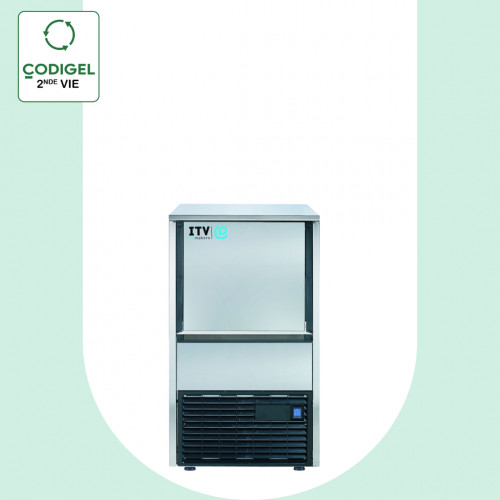 Machine à glaçons - Gamme QUASAR - Production (24H): 36kg - Stockage: 12kg - Carrosserie inox AISI-304 18/10 - Système à palettes (adapté aux eaux les plus calcaires) - Refroidissement EAU - Glaçons creux 20 g - Compresseur : 1/4 cv - Glaçons par cycle : 25 - Consommation d'eau (L/h) : 18,1 - Porte glissant vers l'intérieur - Arrêt électromécanique du cycle - Pas de thermostat de cuve - Vidange : 20 mm (par gravité) - Pieds de 57 mm