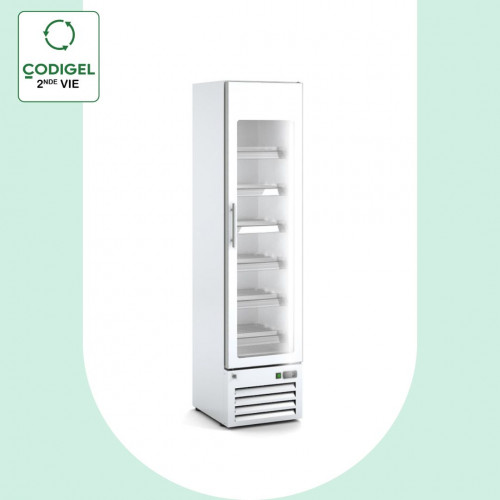 Armoire d'exposition 1 porte - Température (-25° , -15°C)-Extérieur et intérieur en acier plastifié blanc - Etagère en file d'acier plastifié, réglable - Compresseur hermétique à haut couple de démarrage- Evaporateur ventilé imprimé sur plaque d'aluminium - Contrôle digital de température et du dégivrage - Eclairage intérieur led - Condensateur ventilé - Isolation en polyuréthane injecté - Evaporation automatique de l'eau de dégivrage