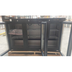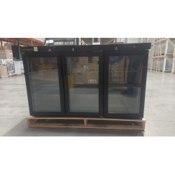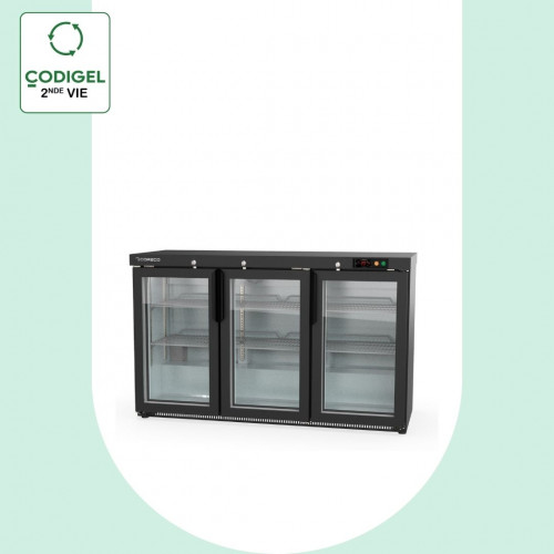 Arrière bar - Température +2°/+8°C - 3 portes vitrées battantes (double vitrage) - Stockage : 320 bouteilles (33cl) - Capacité : 307l - Extérieur en acier galvanisé plastifié noir - Intérieur en acier plastifié gris - Eclairage intérieur LED - Serrure en standard - Thermostat électronique avec afficheur digital, spécial économie d'énergie, protégé des projections - Compresseur hermétique ventilé - Evaporateur et condenseur ventilés - Evaporation automatique des eaux de dégivrage - Alarme haute et basse température sur contrôleur digital - Livré sur tampons réglables - Livré avec 2 clayettes rilsan réglables en hauteur