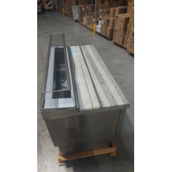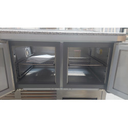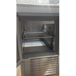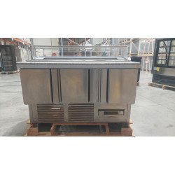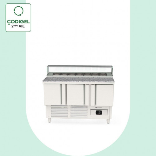 Meuble 700 positif - Série saladette GASTRO - Série Top - Température 0°/+8°C - 3 portes pleines - Capacité 320L - Dessus granit + pare haleine de 250mm pour recevoir en plan incliné des bacs 1/6 prof. 100 - Capacité 7 bacs GN1/6 - Extérieur et intérieur en inox AISI-304 18/10 (sauf partie arrière) - Thermostat électronique avec afficheur digital, spécial économie d'énergie - Alarme haute et basse température sur contrôleur digital - Compresseur hermétique ventilé sur glissières - Evaporateur ventilé traité anti-corrosion - Evaporation automatique des eaux de dégivrage - Porte emboutie et réversible - Charnières inox - Joint déclispable - Pieds inox réglables (90 à 135mm) - Bacs non fournis - Livré avec 1 clayette rilsan GN1/1 + 1 jeu de glissières par porte - Ambiance 32°C