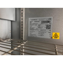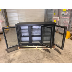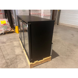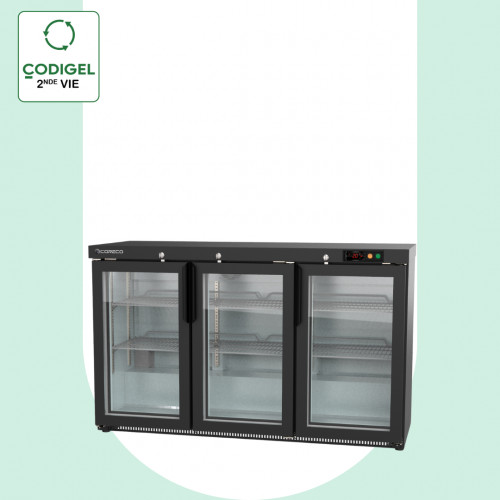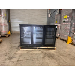 Arrière bar - Température +2°/+8°C - 3 portes vitrées battantes (double vitrage) - Stockage : 320 bouteilles (33cl) - Capacité : 307l - Extérieur en acier galvanisé plastifié noir - Intérieur en acier plastifié gris - Eclairage intérieur LED - Serrure en standard - Thermostat électronique avec afficheur digital, spécial économie d'énergie, protégé des projections - Compresseur hermétique ventilé - Evaporateur et condenseur ventilés - Evaporation automatique des eaux de dégivrage - Alarme haute et basse température sur contrôleur digital - Livré sur tampons réglables - Livré avec 2 clayettes rilsan réglables en hauteur
