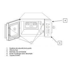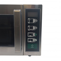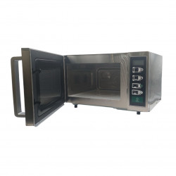 Four à micro-ondes cafétéria - Intérieur et extérieur en inox - Capacité : 25l - Sole fixe en céramique - Dimensions intérieures : 335x364x212 - Commande : minuterie préprogrammée + bouton marche/arrêt - Durée du cycle : 45 secondes - Sonnerie en fin de cycle - Puissance : 1100 w