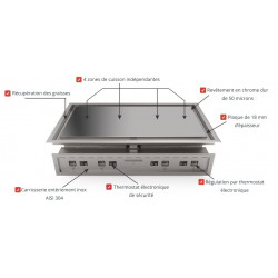 Plaque au chrome électrique - Grosse production - Zone de chauffe : 1200x600 - 4 zones de cuisson - Puissance : 10 kW - Carrosserie entièrement inox 18/10 - Plancha lisse ou rainurée (option, en standard à droite) - Sur support aluminium + acier (épaisseur totale 22mm) recouvert de chrome dur 50 microns - Thermostat électronique à touche digitale - Régulation par thermostat 280°C (1 thermostat tous les 30cm) - Accumulation et diffusion de la chaleur homogène sur toute la surface - Récupération des graisses par rigole sur les 4 cotés - 1 tiroir à graisse en façade avec une capacité de 3 litres - Nettoyage facile sans détergent - LIVRÉ AVEC GRATTOIR, BROSSE ET JEU DE LAMES