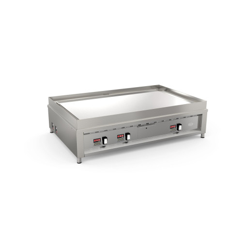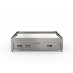 Plaque au chrome électrique - Grosse production - Zone de chauffe : 1000x600 - 2 zones de cuisson - Puissance : 15 kW - Carrosserie entièrement inox 18/10 - Plancha lisse ou rainurée (option, en standard à droite) - Sur support aluminium + acier (épaisseur totale 22mm) recouvert de chrome dur 50 microns - Thermostat électronique à touche digitale - Régulation par thermostat 280°C (1 thermostat tous les 30cm) - Accumulation et diffusion de la chaleur homogène sur toute la surface - Récupération des graisses par rigole sur les 4 cotés - 1 tiroir à graisse en façade avec une capacité de 3 litres - Nettoyage facile sans détergent - LIVRÉ AVEC GRATTOIR, BROSSE ET JEU DE LAMES