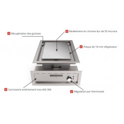 Plaque au chrome électrique - Zone de chauffe : 350x500 - 1 zone de cuisson - Puissance : 4 kW - Carrosserie entièrement inox 18/10 - Plancha lisse ou rainurée (option, en standard à droite) - Partie supérieure monobloc avec plaque soudée étanche 18 mm - Bain chrome rectifié miroir 50 microns - Régulation par thermostat indépendant max. 280-290°C - 1 tiroir à graisse avec une capacité de 4 litres - Nettoyage facile sans détergent - Possibilité d'adapter une presse pour cuisson double face