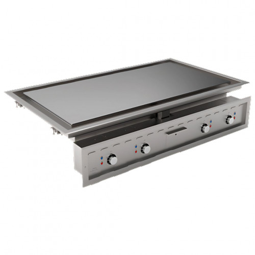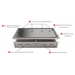 Plaque au chrome électrique - Zone de chauffe : 1200x500 - 4 zones de cuisson - Puissance : 20 kW - Carrosserie entièrement inox 18/10 - Plancha lisse ou rainurée (option, en standard à droite) - Partie supérieure monobloc avec plaque soudée étanche 18 mm - Bain chrome rectifié miroir 50 microns - Régulation par thermostat indépendant max. 280-290°C - 1 tiroir à graisse avec une capacité de 4 litres - Nettoyage facile sans détergent - Possibilité d'adapter une presse pour cuisson double face
