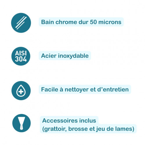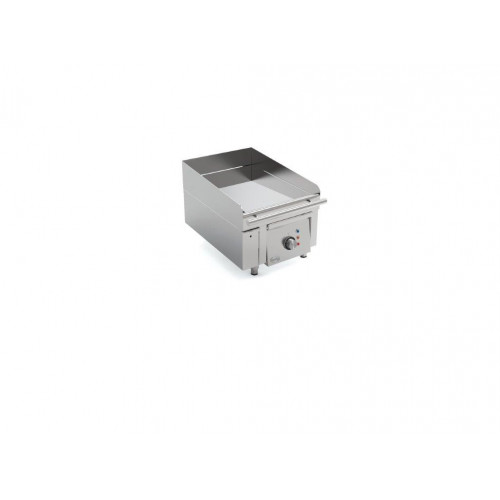 Plaque au chrome électrique - Zone de chauffe : 350x500 - 1 zone de cuisson - Puissance : 4 kW - Carrosserie entièrement inox 18/10 - Plancha lisse ou rainurée (option, en standard à droite) - Partie supérieure monobloc avec plaque soudée étanche 18 mm - Bain chrome rectifié miroir 50 microns - Régulation par thermostat indépendant max. 280-290°C - 1 tiroir à graisse avec une capacité de 4 litres - Nettoyage facile sans détergent - Possibilité d'adapter une presse pour cuisson double face