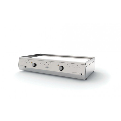 Plaque au chrome électrique - Zone de chauffe : 900x400 - 2 zones de cuisson - Puissance : 5 kW - Carrosserie entièrement inox 18/10 - Plancha toujours lisse (pas de possibilité de rainurage) - Partie supérieure monobloc avec plaque soudée étanche 18 mm - Bain chrome 25 microns - Régulation par thermostat max. 280-290°C - Résistances blindées en acier inoxydable - 2 tiroirs à graisse avec une capacité de 2 litres - LIVRÉ AVEC GRATTOIR, BROSSE ET JEU DE LAMES