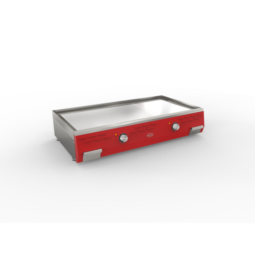 Plaque au chrome électrique - Zone de chauffe : 900x400 - 1 zone de cuisson - Puissance : 5 kW - Carrosserie entièrement inox 18/10 avec façade rouge - Plancha toujours lisse (pas de possibilité de rainurage) - Partie supérieure monobloc avec plaque soudée étanche 18 mm - Bain chrome 50 microns - Régulation par thermostat max. 280-290°C - Résistances blindées en acier inoxydable - 1 tiroir à graisse avec une capacité de 2 litres - LIVRÉ AVEC GRATTOIR, BROSSE ET JEU DE LAMES