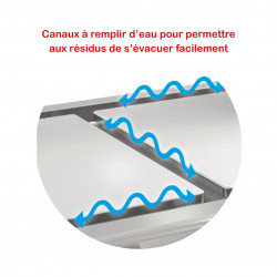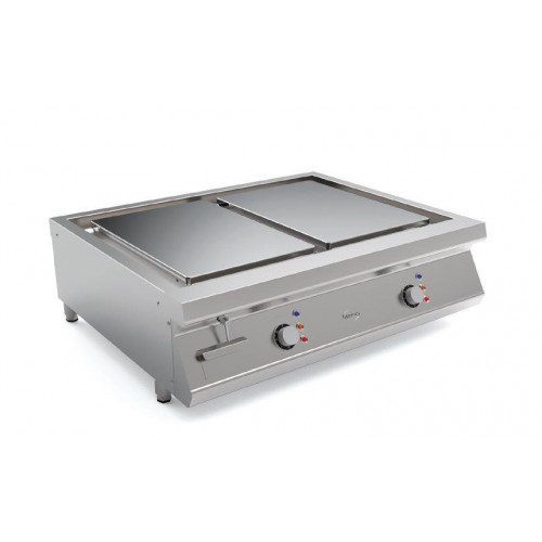 Plaque au chrome électrique avec ilots séparés - 2 zones de cuisson (2 x 356x515mm) - 6 résistances - Puissance : 8 kW - Carrosserie entièrement inox 18/10 - Disposition des plaques en ilots séparés par des canaux à remplir d'eau pour permettre aux résidus de s'évacuer facilement - Plancha liche ou rainurée (en option) pour la cuisson des viandes, poissons ou légumes - Epaisseur de la plaque : 18mm - Bain de chrome rectifié miroir dur 50 microns - Régulation par thermostat indépendant - Température maximum jusqu'à 290°C - Tiroir à graisse inox en façade de 3L - Nettoyage et entretien facile sans détergent - Modèle à poser sur table, livré sur 4 pieds - Livré avec une raclette, brosse métallique et spatule en inox