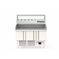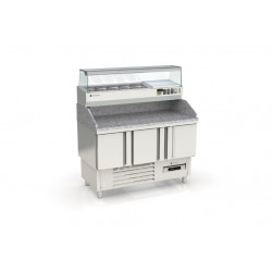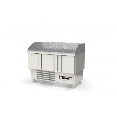 Meuble positif - Série pizza compact 700 - Série Top - Température -2°/+8°C - 3 portes pleines - Capacité 320L - Dessus granit avec dosseret et joues de 180 mm - Extérieur et intérieur en inox AISI-304 18/10 (sauf partie arrière en galva) - Thermostat électronique avec afficheur digital, spécial économie d'énergie - Alarme haute et basse température sur contrôleur digital - Evaporateur ventilé traité anti-corrosion - Compresseur hermétique ventilé sur glissières - Evaporation automatique des eaux de dégivrage - Porte emboutie et réversible - Charnière inox - Joint déclispable - Pieds inox réglables en hauteur de 90 à 1350 mm - Livré avec 1 clayette rilsan GN1/1 et 1 jeu de glissière par porte réglable en hauteur - Ambiance 32°C
