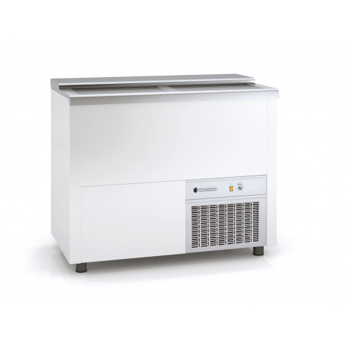 Refroidisseur à bouteilles et cannettes - Série fond ESCALIERS - Température +0°+7°C - 2 portes coulissantes inox - Capacité : 270l - 1 séparation intérieure - Extérieur tôle plastifiée blanche (sauf arrière en galva) - Intérieur en galva - Dessus en inox AISI-304 - Pour un stockage économique des bouteilles et cannettes avec un froid maximum - Interrupteur M/A et thermostat électromécanique - Compresseur hermétique ventilé - Evaporateur statique