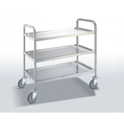 Chariot de transport - 3 étagères 800 x 500 mm - Inox AISI-304 18/10 satiné - Structure renforcée très résistante - Etagères insonorisées très robustes et sans arête coupante - 4 routes pivotantes de diamètre 125 mm (dont 2 avec freins) équipées de supports métalliques et pare-chocs en gomme - Dimensions : 880 x 580 x 960 mm - Livré démonté
