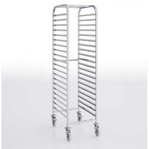 Echelle haute pâtissière - Inox AISI-304 18/10 satiné - Dimensions : 515 x 685 x 1855 mm - 20 niveaux - Conçu pour recevoir des plateaux ou des bacs de format 600x400 - Glissières soudées avec butées d'arrêt - Espacement de 75 mm entre chaque niveau - Roues de diamètre 125 mm dont 2 avec freins - Livrée démontée