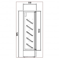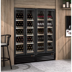 Armoire à vin - Température positive (+4°/+8°C) - (+10°/+18°C) - Capacité 385L - 2 portes vitrées - Extérieur et intérieur en acier plastifié noir - Dégivrage et évaporation par résistance - Eclairage intérieur LEDs - Alarme haute et basse température sur contrôleur digital - Dotation : 5 niveaux d'étagères avec façade en bois de pin massif