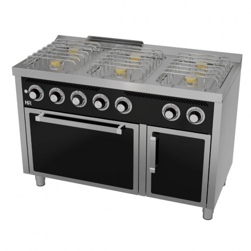 Fourneaux à gaz avec four à gaz – 6 brûleurs – Puissance : 34.5 kW – 3 Brûleurs inf: 3.5 kW // 3 Brûleurs sup : 6.5 kW // Four : 6 kW - Brûleurs supérieurs nickelés de haute efficacité thermique – Acier inoxydable – Grilles supérieures en acier chromé – Grille de four amovible avec système anti-capotage – Vanne thermostatique dans le four - Four avec allumage automatique – Thermocouple de sécurité – Grilles de four facilement amovibles, pour nettoyage facile – Cheminée de hauteur minimal, pour utilisation de casseroles de grand diamètre – Bourrelet de fibre en verre, haute résistance et haute efficacité énergétique – Pieds réglables