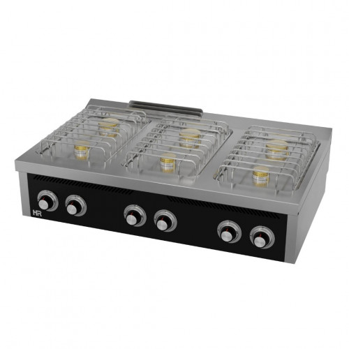 Fourneaux à gaz à poser – 6 brûleurs – Puissance : 28,5 kW – 3 Brûleurs inf: 3.5 kW // 3 Brûleurs sup : 6.5 kW - Brûleurs supérieurs nickelés de haute efficacité thermique – Acier inoxydable – Grilles supérieures en acier chromé – Thermocouple de sécurité – Cheminée de hauteur minimal, pour utilisation de casseroles de grand diamètre