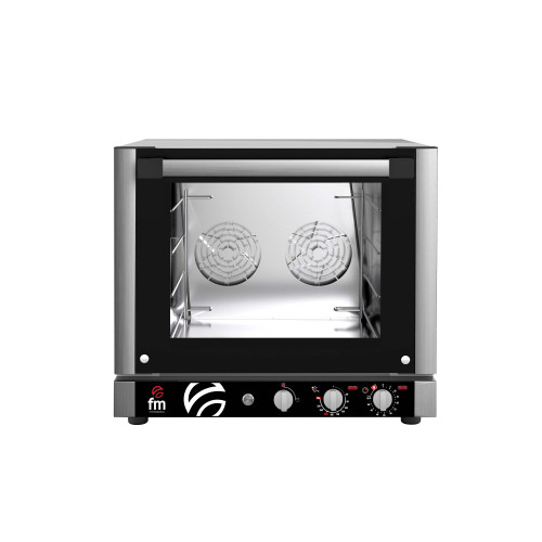 Four à air pulsé - Capacité : 4 clayettes (480x340) incluses - Dimensions intérieures : 500x410x350 - Intérieur et extérieur inox - Système électromécanique avec humidificateur (actionné par bouton pression, branché sur le réseau d'eau, projection d'eau sur la résistance du four) - Grill - Température maximum de 250°C - Rack démontable - Alarme de fin de cycle - Témoins lumineux de fonctionnement - Prévoir une distance de 120 mm à l'arrière pour la sécurité pour nettoyage facile - Thermostat de sécurité - Minuterie : 0 à 60 mn et mode continu - Lumière intérieure - Porte double vitrage démontable - Alarme de fin de cycle - Témoins lumineux de fonctionnement - Prévoir une distance de 120 mm à l'arrière pour la sécurité - Distance entre les niveaux : 80 mm - Puissance : 3100 w