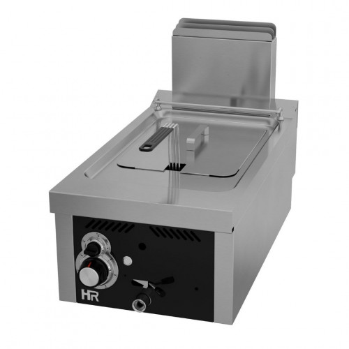 Friteuse de table – Avec vidange - Puissance 9 kW - Acier inoxydable – Allumage électrique et flamme pilote protégée – Panier en acier nickelé – Pieds réglables -Régulation de la température de 110°C à 190°C Cuve en acier inoxydable avec zone froide - Thermostat de sécurité à réarmement 230°C – Friteuse avec coffret incorporé, filtre de récupération d’huile – Tube de vidange amovible- Capacité huile : 12 L