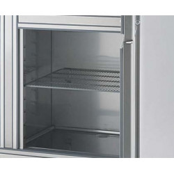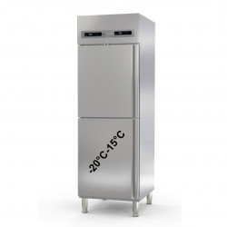 Armoire GN2/1 bi-température - Température positive (-2°/+8°C) et compartiment négatif (-15°/-20°C) - Capacité 280 + 280l - 2 portillons pleins - Extérieur en inox AISI-304 18/10 (sauf partie arrière) - Intérieur en inox AISI-304 - Evaporateur anti-corrosion et compresseur hermétique ventilé - Thermostat électronique avec affichage digital - Panneau de commande relevable pour faciliter l'accès au groupe - Arrêt de la ventilation à l'ouverture de la porte - Dégivrage et évaporation par résistances - Lumière intérieure LED - Serrure en standard - Pieds inox réglables de 125 à 200mm - Ambiance 43°C - Dotation : 2 clayettes inox GN2/1 et 2 jeux de glissières inox