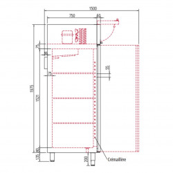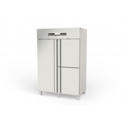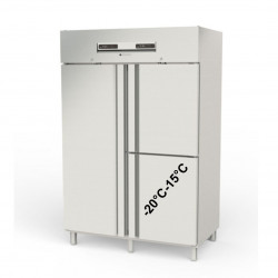 Armoire GN2/1 bi-température - Température positive (-2°/+8°C) et compartiment négatif (-15°/-20°C) - Capacité 1050 + 280l - 1 porte pleine et 2 portillons dont un négatif - Extérieur en inox AISI-304 18/10 (sauf partie arrière) - Intérieur en inox AISI-304 - Evaporateur anti-corrosion et compresseur hermétique ventilé - Thermostat électronique avec affichage digital - Panneau de commande relevable pour faciliter l'accès au groupe - Arrêt de la ventilation à l'ouverture de la porte - Dégivrage et évaporation par résistances - Lumière intérieure LED - Serrure en standard - Serrure en standard - Pieds inox réglables de 125 à 200mm - Ambiance 43°C - Dotation : 5 clayettes inox GN2/1 et 5 jeux de glissières inox