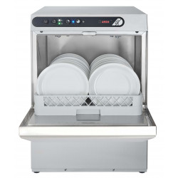 Lave vaisselle 50x50 - ECOLINE - Avec adoucisseur - Carrosserie inox AISI-304 18/10 satiné simple paroi - Porte double paroi - Cuve emboutie - Finition scotch brite pour faciliter le nettoyage et la maintenance - Commandes électromécaniques - Nouveau chassis embouti - Charnières renforcées - Système d'arrêt du cycle en cas d'ouverture de la porte - Double système de filtration innovant - Panneau de commandes avec boutons rétro-éclairé par LED - Bras de lavage en composite - Cycle 1-3 min - Doseur automatique de produit de rinçage - Vidange par gravité - Contenance bac : 17 L - Contenance surchauffeur : 7L - Alim : 2 à 4 bars- Température de lavage : 55°C - Température de rinçage : 82°C - Dotation : 1 panier universel + 1 godet à couverts - Passage utile : 34 hors tout - Consommation (/cycle) : 1,5 L