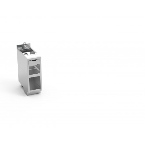 Module avec évier pour la préparation de cocktails ou de boissons mixtes - Fabriqué en acier inoxydable AISI-304 18/10, finition satinée - L'option table a une structure en tube d'acier inoxydable de 40x40mm, entièrement soudée au plan de travail - Plan de travail avec panneau arrière de 80 mm - Robinet mitigeur inclus - Lave-vaisselle à l'intérieur de la cuve - Planche à découper/striker en polyéthylène, amovible pour le nettoyage - Fond perforé dans toute la cuve. Support pour rouleau de papier - Tiroir avec ouverture frontale pour le rangement des outils