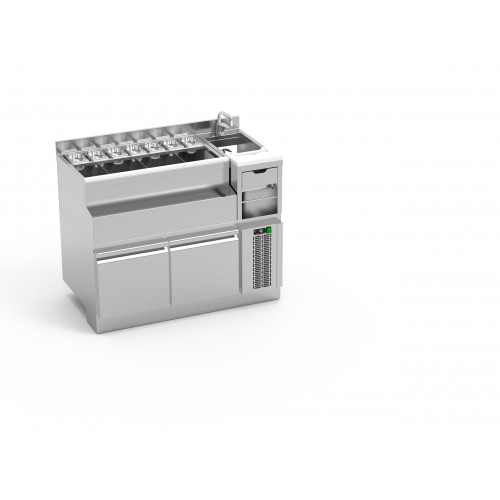 Module réfrigéré pour construction de bars modulaires destinés à servir des cocktails ou des boissons mélangées - Fabriqué en acier inoxydable AISI-304 18/10, finition satinée - Evier pour mixologie avec bords sanitaires et système d'insonorisation - Avec tiroir, porte-rouleau de papier et porte-gobelet - Plan de travail avec panneau arrière de 80 mm - Robinet mitigeur inclus - Bac à glaçons avec plateau perforé, planche à découper en polyéthylène - Support pour bouteilles - Emplacement pour bacs (bacs non inclus)