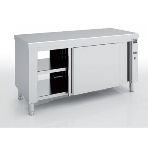 Meuble chaud fermé - Traversant - Sans dosseret - Inox AISI-304 18/10 satiné - Dimensions : 1200 x 600 x 850 mm - Portes coulissantes suspendues silencieuses avec guide de portes sur roulement à billes - Dessus et étagère intérieure renforcés par omegas - Panneau de contrôle avec interrupteur lumineux et thermomètre - Thermostat digital réglable de 50° à 75°C - Chauffage intérieur par résistances ventilées facilement démontables - Protection thermique de sécurité par fusible - Rendement énergétique optimisé grâce à l'isolation intégrale double parois et fibre de verre (meuble et portes) - Etagère intérieure réglable - Pieds robustes et réglables en hauteur - Puissance : 2100 w