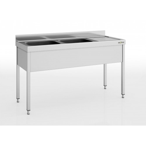 Plonge standard série 600 + 2 bacs + 1 égouttoir à droite - Inox AISI-304 18/10 satiné - Dimensions : 1600 x 600 - Bac de dimensions: 500 x 400 x 250 - Livré avec siphon, tube surverse et cache-bac- Sans robinetterie ni pré-perçage - Egouttoir nervuré à bords anti-ruissellement- Dosseret de 100 mm - Table démontable (livrée démontée) - Cuve emboutie et insonorisée - 4 pieds carrés 40 x 40 mm avec hauteur réglable de 850 à 930 mm