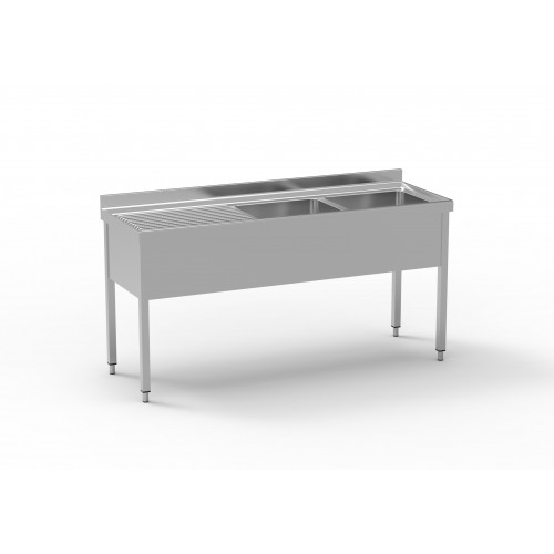 Plonge standard série 600 + 2 bacs + 1 égouttoir à gauche - Inox AISI-304 18/10 satiné - Dimensions : 1800 x 600 - Bac de dimensions: 500 x 400 x 250 - Livré avec siphon, tube surverse et cache-bac- Sans robinetterie ni pré-perçage - Egouttoir nervuré à bords anti-ruissellement- Dosseret de 100 mm - Table démontable (livrée démontée) - Cuve emboutie et insonorisée - 4 pieds carrés 40 x 40 mm avec hauteur réglable de 850 à 930 mm