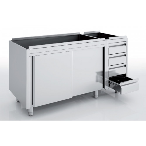 Meuble neutre avec bloc tiroirs série 700 - Meuble sans dessus - 4 tiroirs série 700 GN1/1 prof. 100 - Inox AISI-304 18/10 satiné - Dimensions : 2200 x 700 x 850 mm - Portes coulissantes suspendues silencieuses avec guide de portes sur roulements à billes - Etagère intérieure renforcée par omega - Etagère intérieure réglable en hauteur sur supports très résistants - Pieds robustes et réglables en hauteur