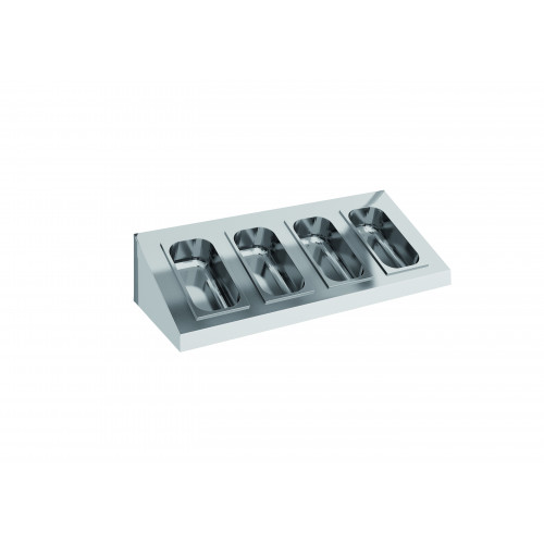 Etagère murale en plan incliné profondeur 250 mm - Longueur : 1000 mm - A fixer sur montant à crémaillères - Inox AISI-304 18/10 satiné - Etagère facilement repositionnable et réglable en hauteur