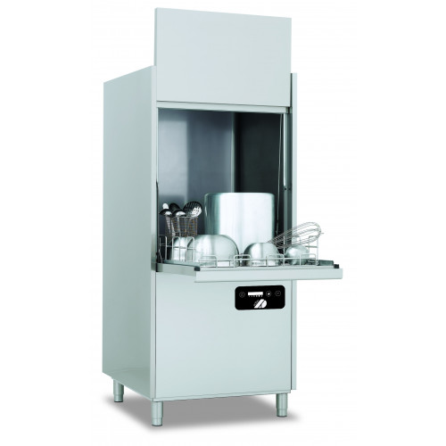 Lave-batterie / Lave-ustensiles - Carrosserie inox AISI-304 18-10 satiné double paroi - Commandes électroniques - Bras supérieurs et inférieurs rotatifs en inox facilement extractibles pour le nettoyage - Cuve emboutie - Doseur de produit de rinçage - Doseur de produit de lavage - Doseur de produit de lavage intermittent - Pompe de rinçage - Cycle auto-nettoyant - Ultra-rinçage (débit d'eau chaude constant) - THERMOSTOP activable - Remplissage intelligent activable - Production : 30 paniers/h - Cycle 2-12min - Contenance bac : 68 L - Contenance surchauffeur : 7L - Alim : 1 à 6 bars - Température de lavage : 55°C - Température de rinçage : 85°C - Dotation : 1 panier inox 700x700 - Passage utile : 850 hors tout - Consommation (/cycle) : 4 L