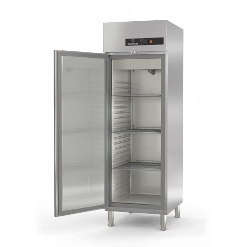 Armoire GN2/1 emboutie - Gamme basic - Température négative (-20°/-15°C) - Capacité 645l - 1 porte pleine - Extérieur et intérieur en inox AISI-304 18/10 (sauf partie arrière) - Côtés emboutis - Evaporateur traité anti-corrosion et compresseur hermétique ventilé - Thermostat électronique avec afficheur digital - Evaporation automatique des eaux de dégivrage - Serrure en standard - Eclairage intérieur LED - Pieds inox réglables de 135 à 200 mm - Ambiance 43°C - Dotation : 3 clayettes rilsan GN2/1 - Isolation 60 mm