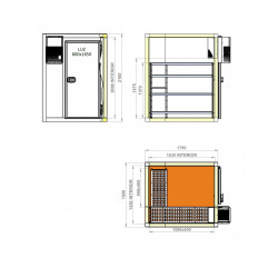 Kit Chambre froide positive 80mm 1590 x 1790 x 2160 mm - groupe paroi - rayonnage en L 4 niveaux H = 1370 mm - Sol renforcé résine phénolique anti-dérapant - Porte non réversible sur ces kits avec serrure et décondamnation intérieure
