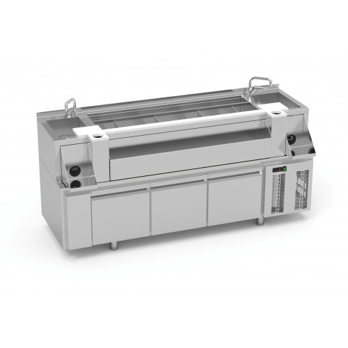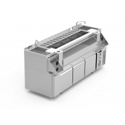 Meuble cocktail réfrigéré - Inox AISI-304 18/8 satiné - 2 éviers de 275x250x165 mm avec vidange - 2 robinets mélangeurs inclus - Grilles égouttoirs démontables avec 2 rince-verres - 2 trous vide-déchets - Planches de découpe en polyéthylène (2 fois 190x260x20mm et 1265x60x20mm) - Cuve isolée thermiquement avec injection de polyuréthane écologique (livré avec séparateurs en acier inoxydable, fond perforé et vidange) - Capacité des cuves isolées : 5 zones pouvant contenir chacune des bouteilles ou de la glace, 1 zone pour bacs à fruits GN (12 GN 1/9 prof. 100 non inclus) - Support frontal capacité 13/15 bouteilles - 2 supports frontaux pour blender, avec passe-câbles d'alimentation - 3 tiroirs réfrigérés en acier inoxydable, avec système de fermeture automatique - Dimensions cuve : 1265 x 405 x 300 mm - Dimensions meuble : 2000 x 740 x 900 mm - Dimensions meuble avec support frontal : 2000 x 780 x 900 mm
