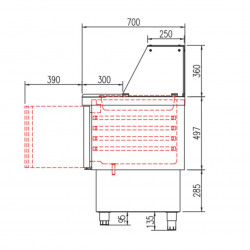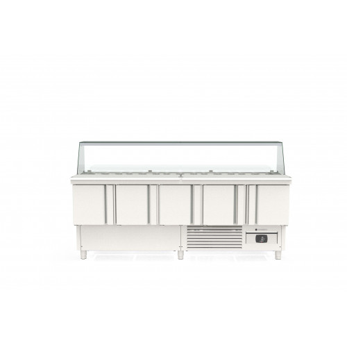 Meuble 700 positif - Série préparation FAST FOOD GN1/1 - Série Top - Température 0°/+8°C - 5 portes pleines - Capacité 560L - Dessus inox avec pare-haleine en verre - Capacité 36 bacs GN1/6 et 6 bacs GN1/9 - Extérieur et intérieur en inox AISI-304 18/10 (sauf partie arrière) - Thermostat électronique avec afficheur digital, spécial économie d'énergie - Compresseur hermétique ventilé sur glissières - Evaporateur entre portes ventilé traité anti-corrosion - Evaporation automatique des eaux de dégivrage - Alarme haute et basse température sur contrôleur digital - Porte emboutie et réversible - Charnières inox - Joint déclispable - Pieds inox réglables (90 à 135mm) - Bacs non fournis - Livré avec 1 clayette rilsan GN1/1 + 1 jeux de glissières par porte + 5 barrettes de séparation - Ambiance 32°C