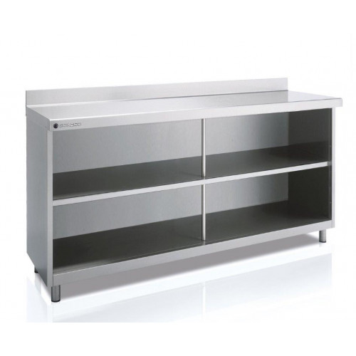 Meuble neutre arrière-bar avec étagère - Construction inox AISI-304 (sauf partie arrière en galva) - Livré en standard avec 1 étagère - Dosseret de 100mm en standard (sans dosseret sur demande) - Pieds inox réglables de 125 à 200mm - Longueur : 2020 mm