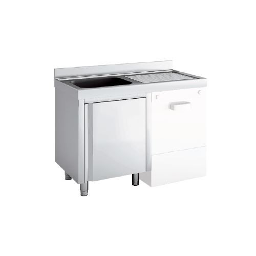 Meuble plonge lave-vaisselle intégré série 600 + 1 bac + 1 égouttoir à droite - Inox AISI-304 18/10 satiné - Dimensions : 1400 x 600 - Bac de dimensions: 500 x 400 x 250 - Espace pour lave-verre - Livré avec siphon, tube surverse et cache-bac - Sans robinetterie ni pré-perçage - Egouttoir nervuré à bords anti-ruissellement- Dosseret de 100 mm - Meuble livré monté et soudé - Arrière ouvert pour permettre l'accès aux installations - Portes coulissantes silencieuses avec guide de portes sur roulements à billes - Cuve emboutie et insonorisée - 4 pieds carrés 40 x 40 mm avec hauteur réglable de 850 à 930 mm